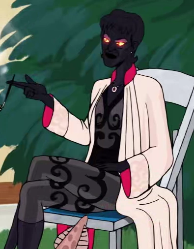 First described by Dr. Mrs. The Monarch as a "spinster who shapechanges" in Return to Malice, Auntie Matter appears in The Devil's Grip where she is seen fraternizing with Flying Squid, lounging on lawnchairs with their feet soaking in a kiddie pool. A small squid bearing a resemblance to Flying Squid (though with no human features) also sits in the pool. Given Dr. Mrs. the Monarch's earlier description of Auntie Matter, it's not clear if this squid represents the result of a romantic union between the pair or if they are merely friends hanging out with a normal squid resting nearby.