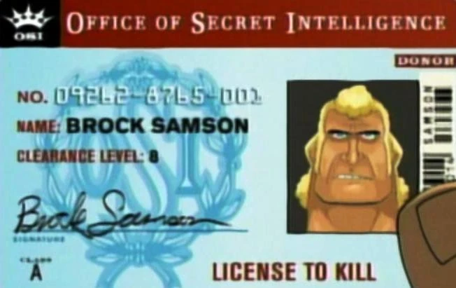 After leaving school, he joined the United States Marines, and was eventually recruited by the Office of Secret Intelligence, an organization of super-agents. There he was taken under the wing of Colonel Hunter Gathers, an eccentric, yet brilliant secret agent, who Brock later described as "the second-closest thing to a father I ever had." As an O.S.I. agent, Brock was granted License to Kill, a freedom he exercised with great zeal and often took pleasure in.