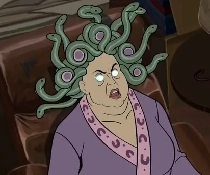Redusa appears as an aging overweight woman with writhing blue snakes for hair.