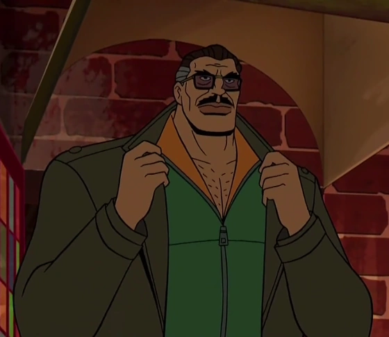 - His green-and-orange tracksuit, mechanical limbs, and New York-based operations suggest him to be based on Spider-Man villain Doctor Octopus.