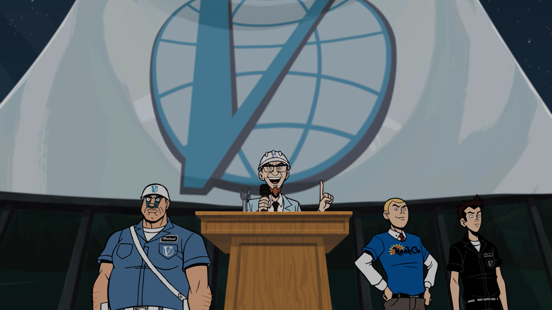 After a few weeks have passed, Doctor Venture has enough applicants for his new project; he organizes them up into three groups organized by different colors of Cleansuits, representing different fields. White Cleansuits represent Development, Orange Cleansuits represent Manufacturing, and Green Cleansuits represent Doc's "Special Class" (Rusty's new personal slaves). After an initial equipment hiccup/explosion, the interns get fast to work on the shielding; within a few days they produce a prototype. Although off to a promising start, the prototype fails the second impact test. Doc then realizes the amount of radiation used in the ray shields and quickly leaves the testing area. Meanwhile, The Monarch undeniably misses Henchman 21.