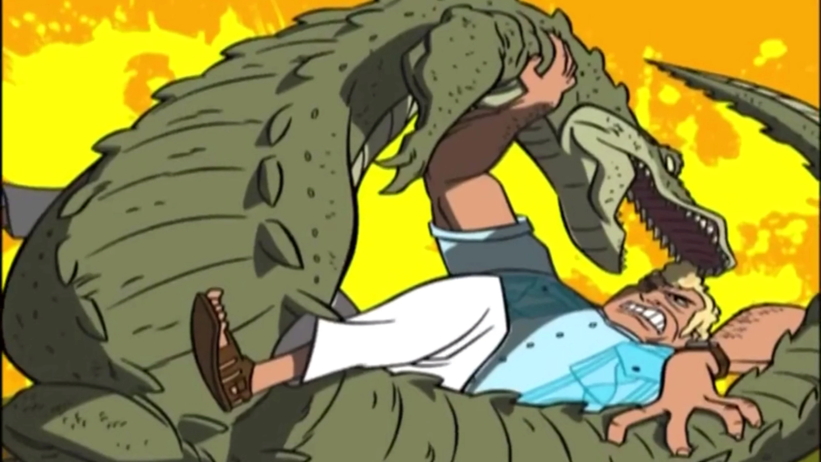 When the Venture Family took the X-1 to visit the United Nations in New York, an alligator got caught in one of the cargo holds and escaped, jumping at Brock Samson as its first target. Although the guards were quick to go for their weapons, Dr. Venture pointed out they did not need to. Brock Samson made quick work of the creature, mutilating and killing the creature with his own bare hands.